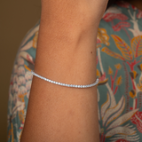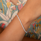 The Diamond Destiny Bracelet is a stunning piece featuring a seamless row of sparkling stones set in polished silver. Perfect for adding timeless elegance and luxury to any look.