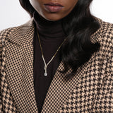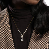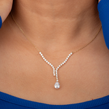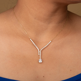 The Cascading Brilliance Necklace features a stunning Y-shaped design with a trail of shimmering stones and a pear-cut drop pendant, crafted in radiant gold for timeless elegance.