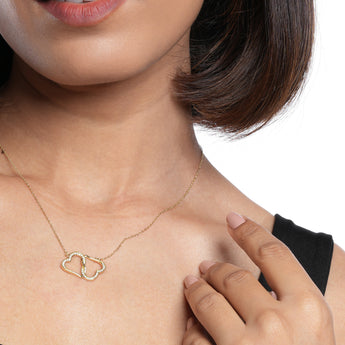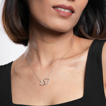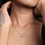 The Diamond Embrace Necklace features intertwined heart motifs adorned with sparkling stones, crafted in radiant gold. A symbol of love and connection, perfect for any occasion.
