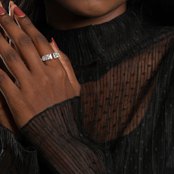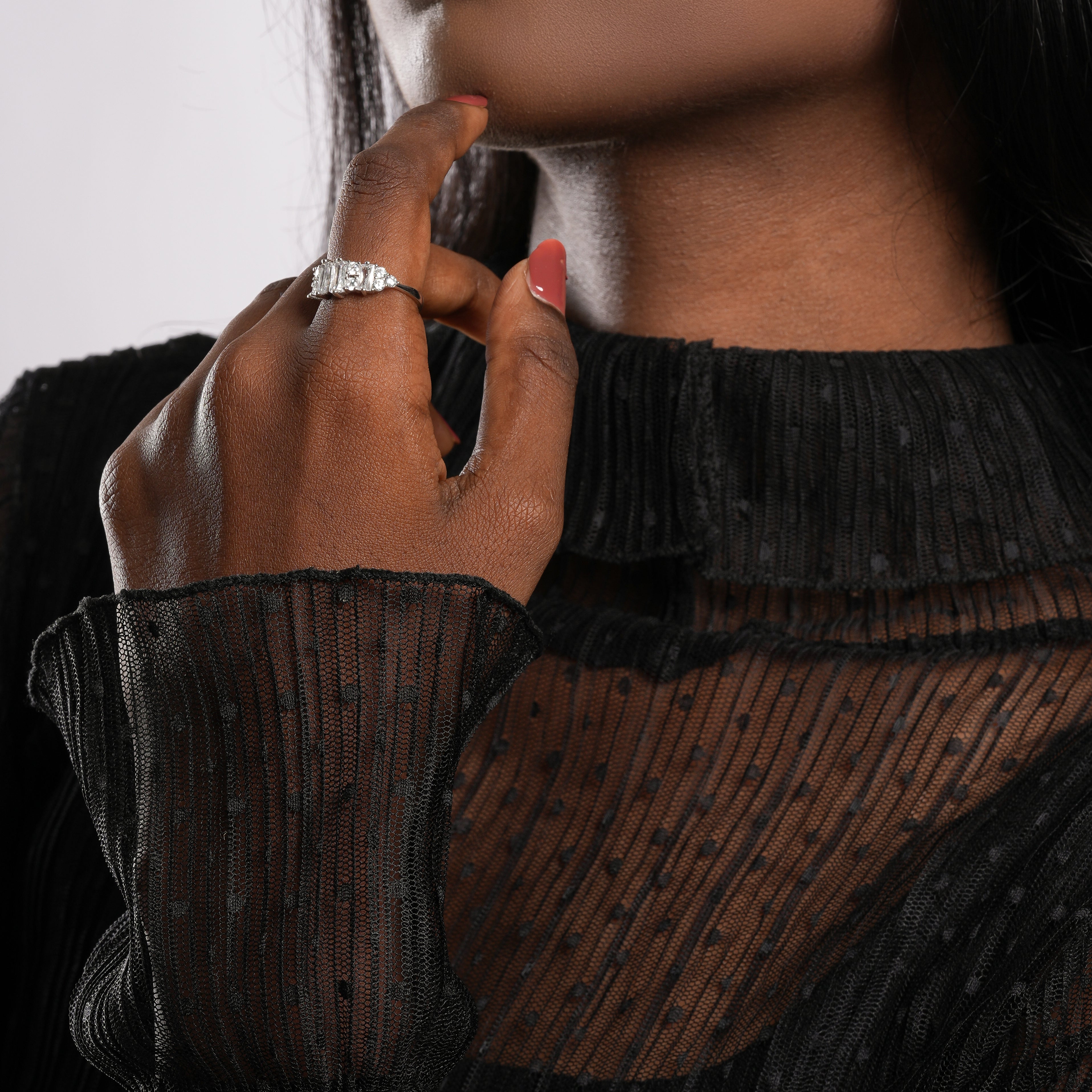 The Asymmetrical Sparkler Ring is a modern masterpiece, featuring a unique design with stunning asymmetrical stones. Crafted in sleek silver, this ring offers a perfect balance of elegance and contemporary style.