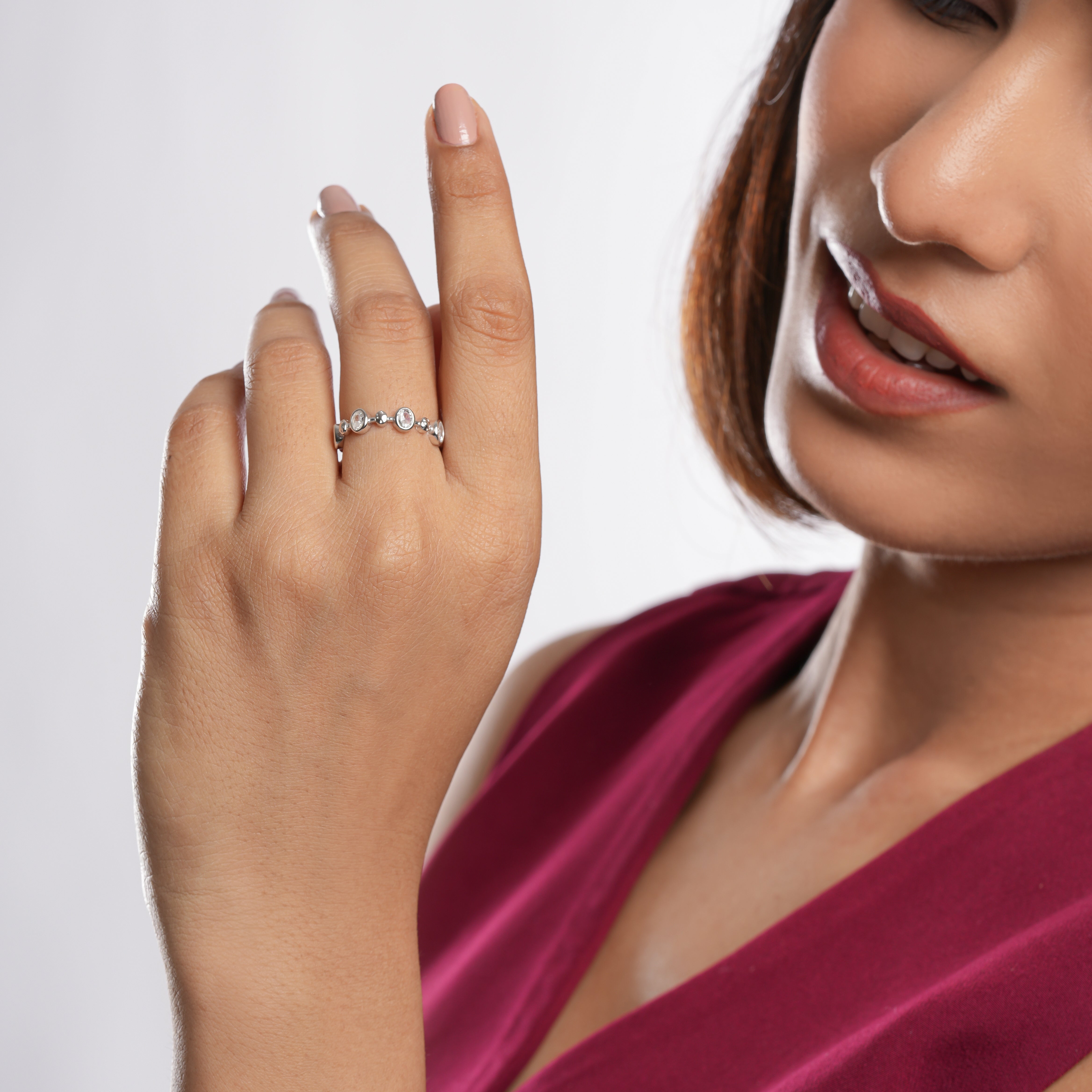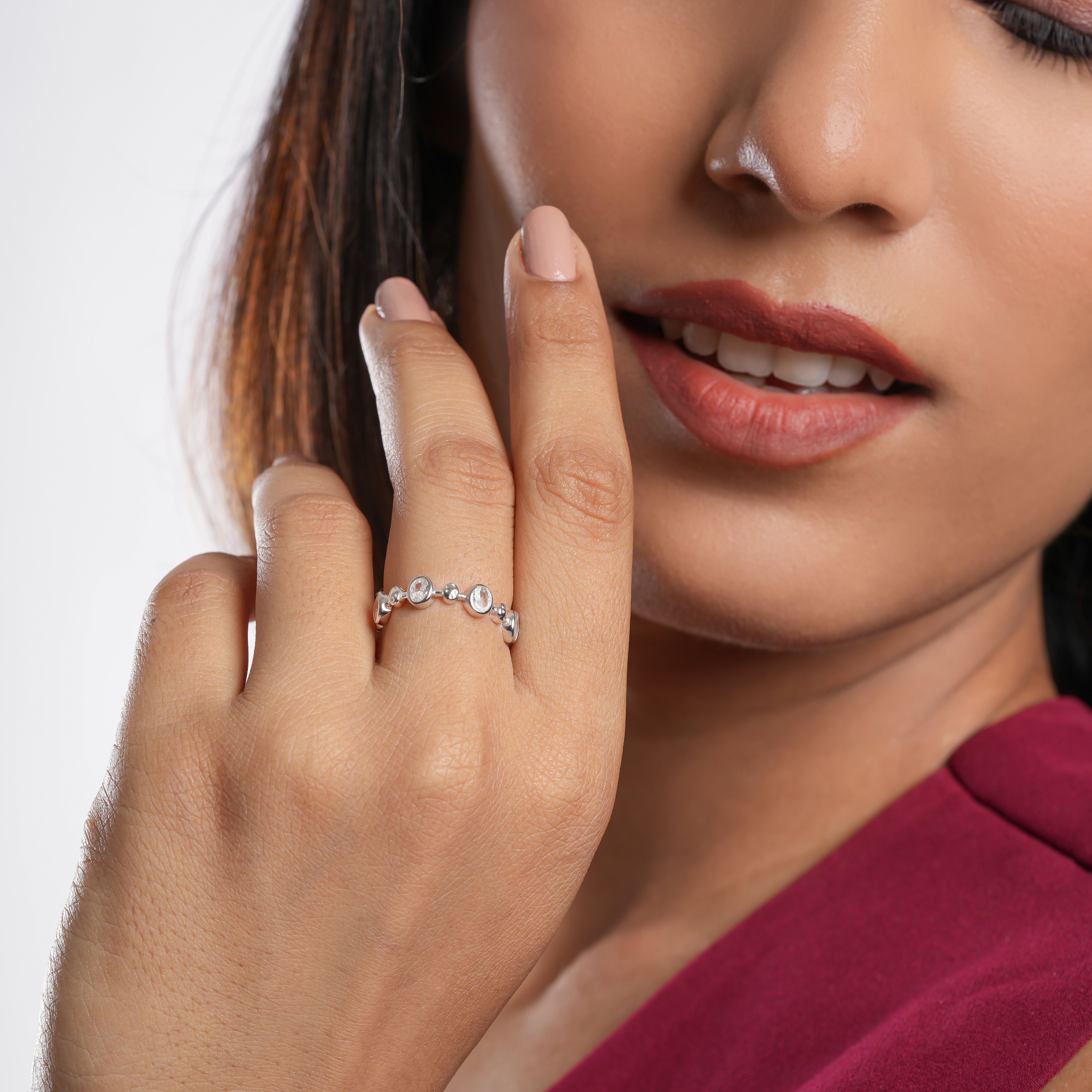 Meet the Orbit Glow Ring — a chic statement of subtle sparkle and modern design. This adjustable open ring features a rhythmic sequence of bezel-set cubic zirconia stones interlinked with polished dots, creating a radiant orbit of brilliance around your finger. Crafted in 925 sterling silver and available in both 18KT gold-plated and classic silver finishes, it's designed for effortless elegance and everyday wear.
