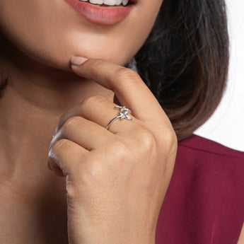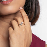 The Starlight Symphony Ring features a delicate design inspired by nature’s elegance, showcasing two sparkling floral motifs. This silver masterpiece brings timeless charm and a celestial sparkle to your jewelry collection.