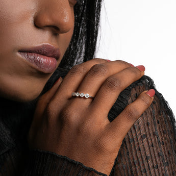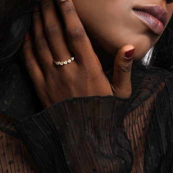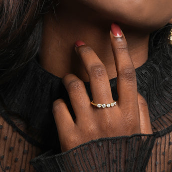 Illuminate your look with the Aurora Glow Ring, featuring 5 sparkling cubic zirconia stones set atop a sleek 925 sterling silver band. Available in elegant 18KT gold plating or classic silver finish, this ring combines minimalist design with dazzling brilliance. Perfect for daily wear or special occasions, its refined sparkle adds a touch of sophistication to any outfit.